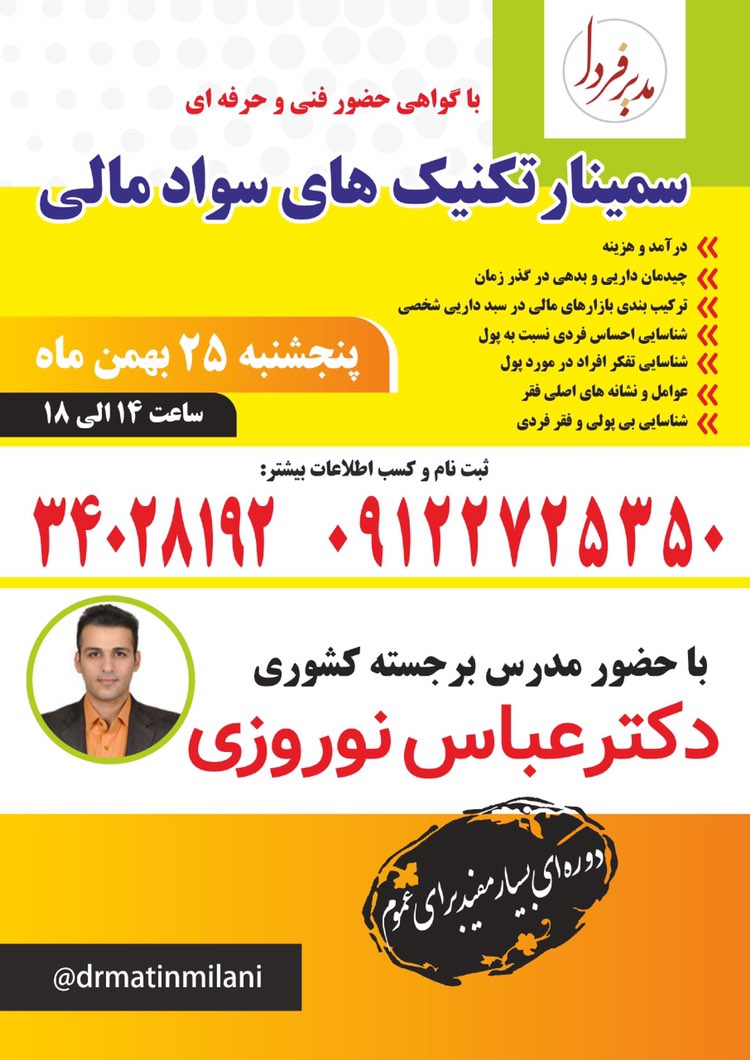 سمینارتکنیکهای سواد مالی -تحولی جدی در اندیشههای مالی شما -دانستنیهایی راهگشا برای خلق ثروت -با ما تماس بگیرید: ۰۹۱۲۲۷۲۵۳۵۰ "موسسه مدیر فردا"