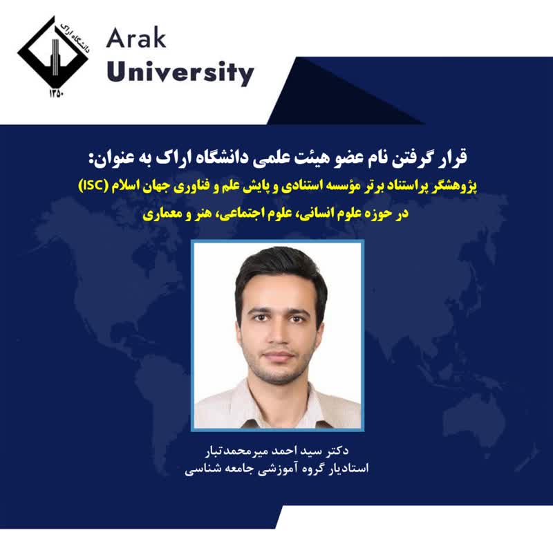 بر اساس آخرین نتایج رتبهبندی مؤسسه استنادی و پایش علم و فناوری جهان اسلام (ISC) در سال ۲۰۲۳، دکتر سید احمد میرمحمدتبار، عضو هیئت علمی گروه آموزشی جامعه شناسی دانشگاه اراک، در جمع پژوهشگران پر استناد برتر ISC در حوزه علوم انسانی، علوم اجتماعی، هنر و معماری قرار گرفت.