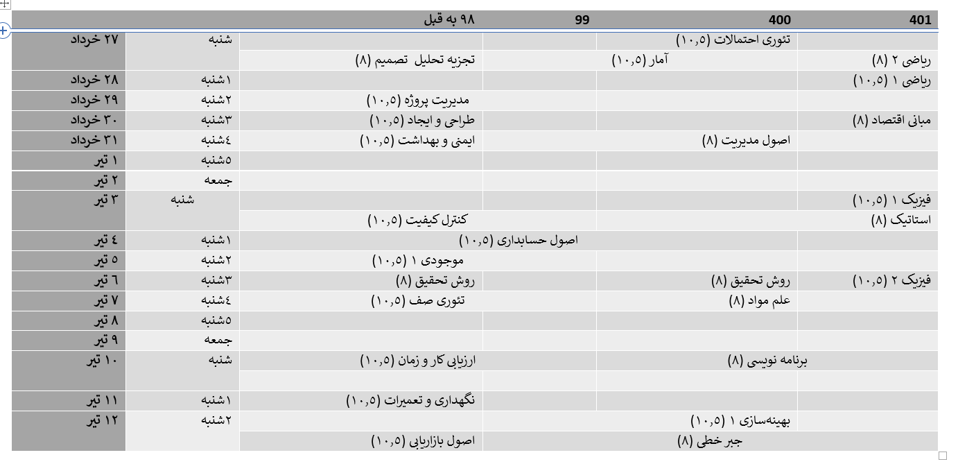 چارت درسی ورودی های 1400